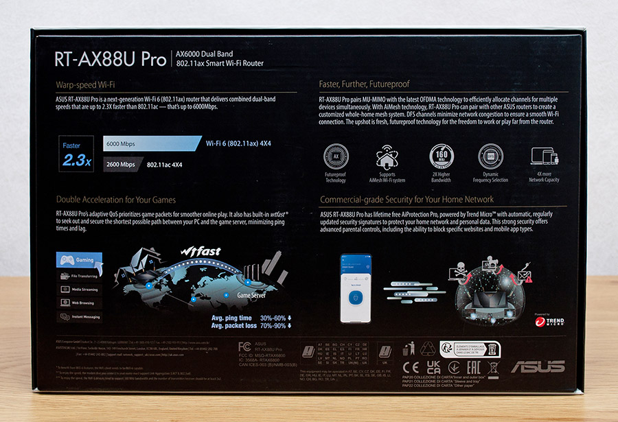 С обратной стороны пользователям предоставляется информация о преимуществах беспроводного стандарта передачи данных IEEE 802.11ax, более чем вдвое быстрее предшественников, игровых функциях RT-AX88U Pro и встроенных средствах информационной безопасности, защищающих данные пользователей от различных сетевых угроз.