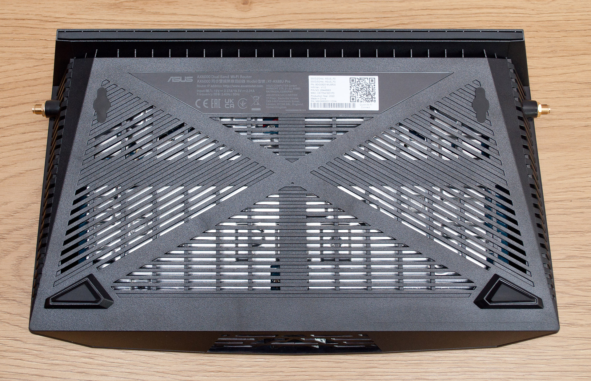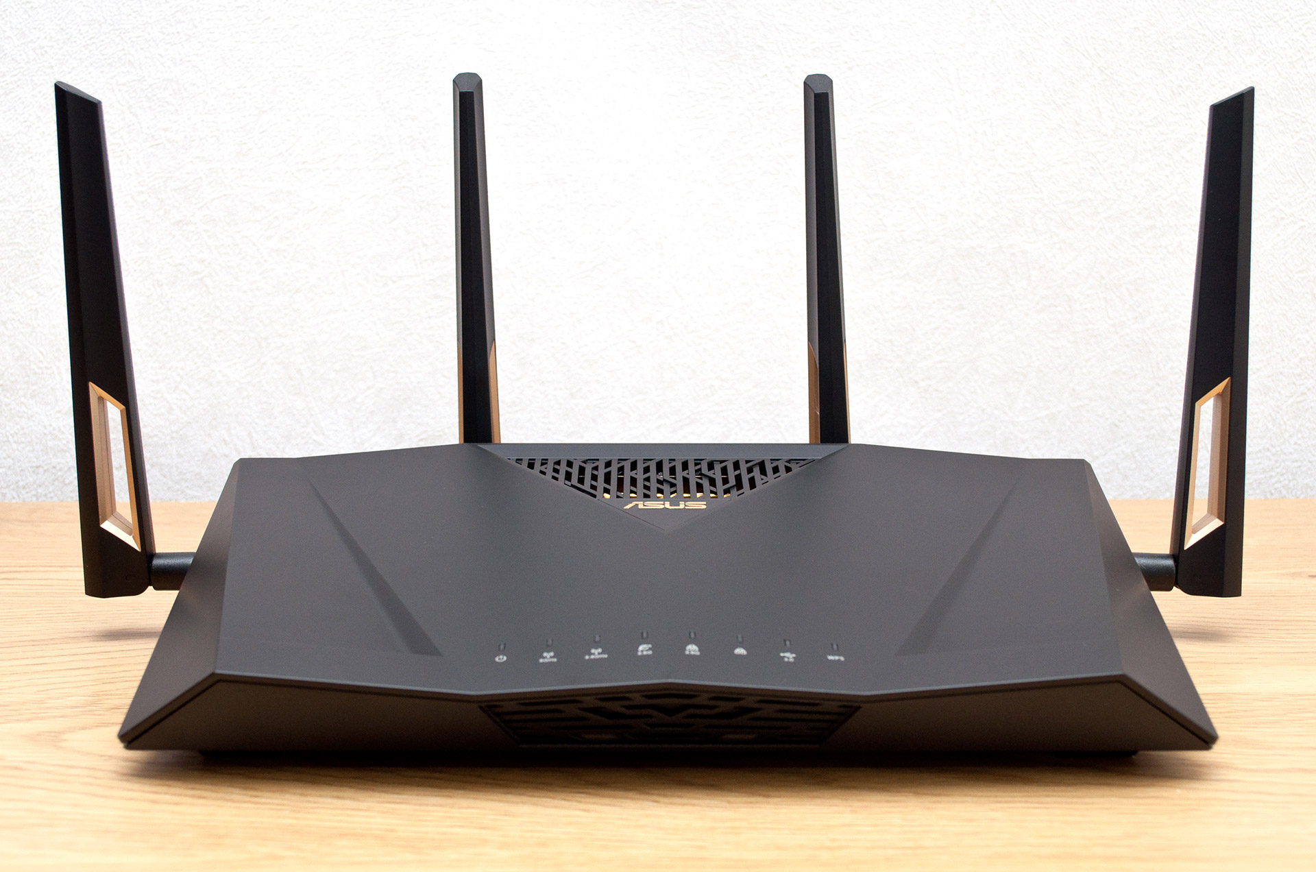 Снаружи отличить ASUS RT-AX88U Pro от предыдущей модели можно только поставив оба устройства рядом. При этом габариты корпуса 300x185x60 мм и масса 1010 г для обоих продуктов остались неизменными. Не поменялись и общий силуэт, который некоторые, конечно, сочтут не слишком привлекательными, и четыре антенны Wi-Fi длиной 170 мм каждая, оснащенные разъемами SMA и угловыми шарнирами. Вдоль центральной оси верхней крышки ближе к заднему краю находится треугольный вырез с вентиляционной решеткой, у вершины которого находится золотистый логотип производителя. Впрочем, в конструкции передней панели произошли определенные изменения: исчез USB-порт в левой части и прикрывавшая его крышка, а с правой стороны место двух кнопок заняла глухая пластиковая панель.