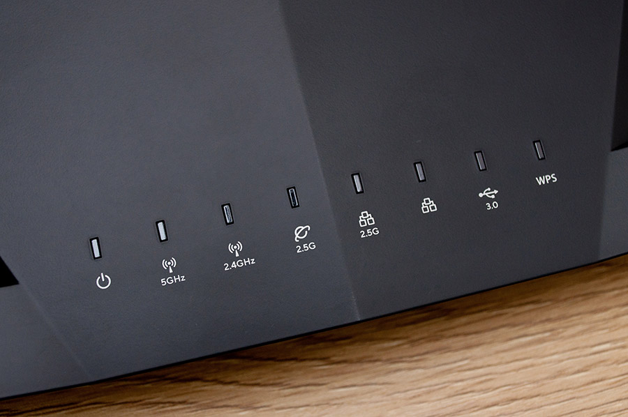 Вдоль переднего края верхней крышки расположены восемь светодиодов, сигнализирующих о наличии питания, активности сетей Wi-Fi и состоянии портов WAN 2.5G, LAN 2.5G и остальных портов локальной сети, наличии подключенного устройства USB и использовании функции WPS, позволяющей быстро подключать беспроводных клиентов.