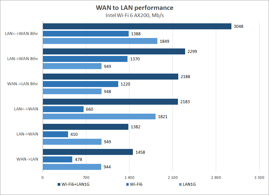Тестирование быстродействия порта 2.5G WAN позволяет понять, что служба NAT не ограничивает пропускную способность. Для проводного и беспроводного клиентов локальной сети результаты достигают физических возможностей сетевых интерфейсов, а при их одновременном использовании наблюдаются скорости около 2200 Мбит/с при многопоточной передаче данных, а в дуплексном режиме быстродействие превышает 3000 Мбит/с.