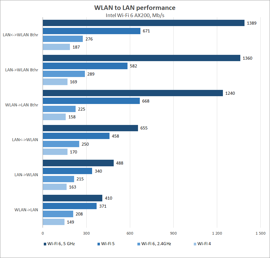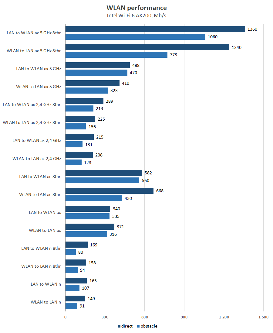 Что касается эффективности подсистемы Wi-Fi, то на частоте 5 ГГц для IEEE 802.11ax устройство демонстрирует стабильно высокие результаты: от 410–488 Мбит/с при передаче данных в один поток до 1240–1360 Мбит/с для текущей передачи. Производительность в режиме IEEE 802.11ac также близка к максимальной и составляет от 340–371 Мбит/с до 582–668 Мбит/с в зависимости от направления и количества информационных потоков. Быстродействие в диапазоне 2,4 ГГц в значительной степени ограничено наличием помех от соседних сетей, впрочем, для Wi-Fi 6 можно рассчитывать на 208–289 Мбит/с, тогда как Wi-Fi 4 показатели несколько скромнее: от 150 Мбит/с до 170 Мбит /с.