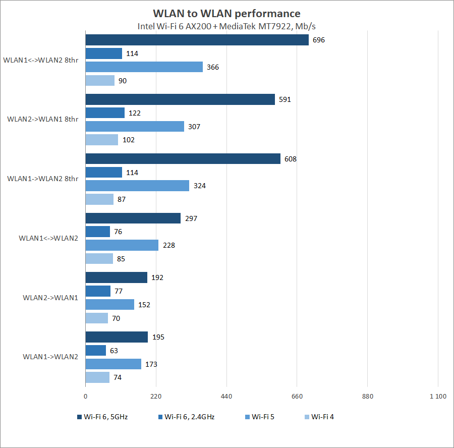 Результаты тестирования пропускной способности при передаче данных между двумя беспроводными клиентами находятся на стабильно высоком уровне: для Wi-Fi 6 на частоте 5 ГГц можно рассчитывать на скорость от 200 Мбит/с до 600 Мбит/с в зависимости от количества информационных потоков, а переключение в режим Wi-Fi 5 обеспечивает показатели на уровне 150–325 Мбит/с. В диапазоне 2,4 ГГц уже не стоит рассчитывать на рекорды быстродействия, тем не менее, для Wi-Fi 6 удается получить 65-120 Мбит/с, тогда как для Wi-Fi 4 пропускная способность лежит в пределах 70-100 Мбит/с.