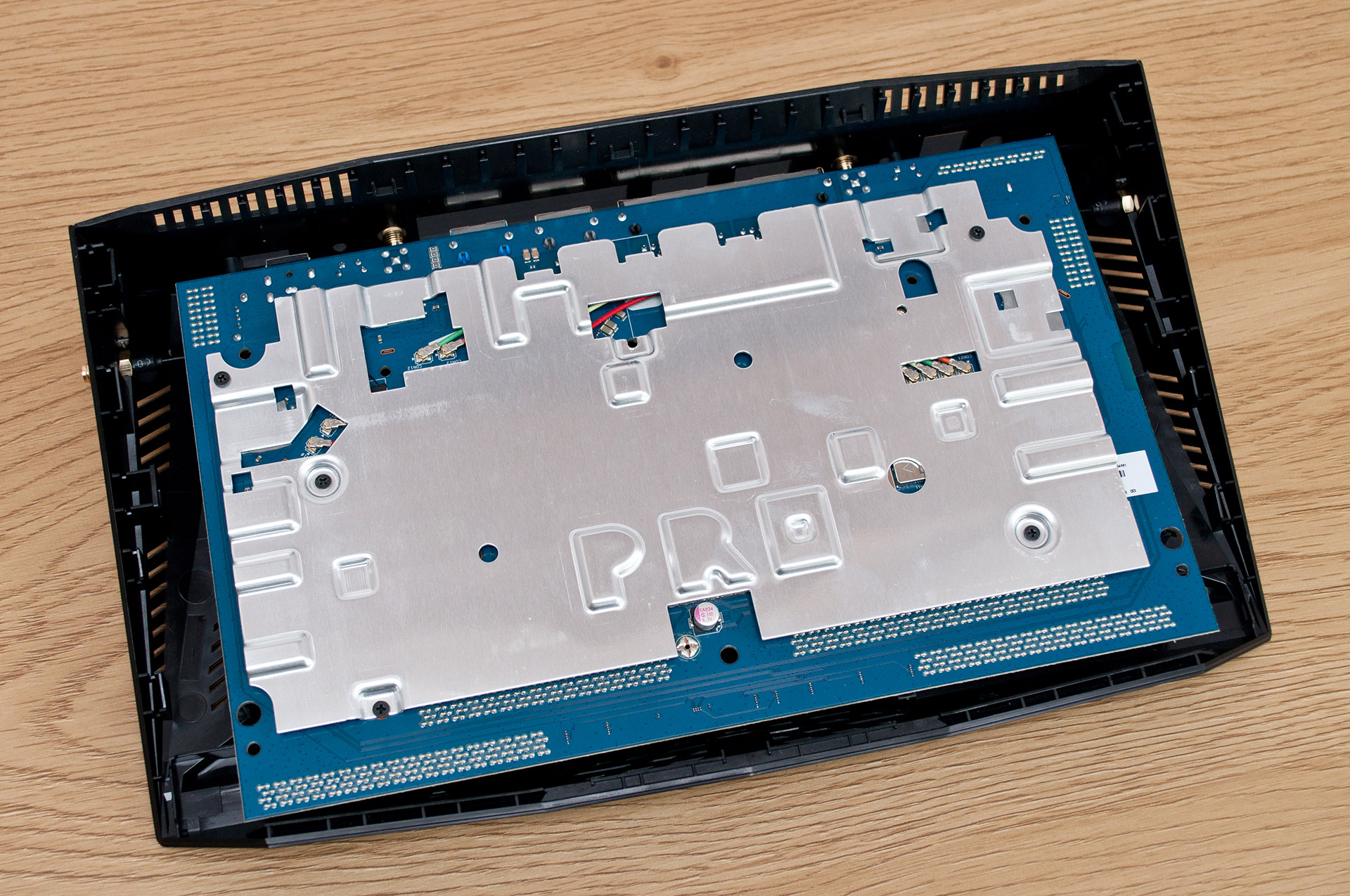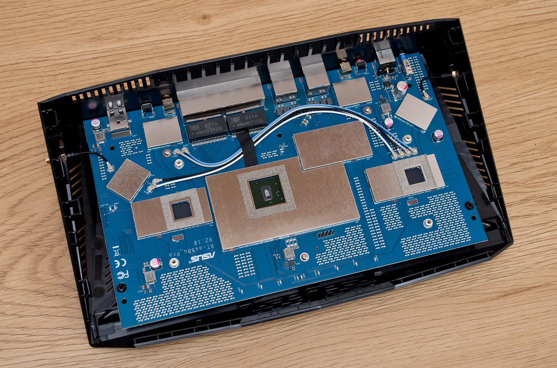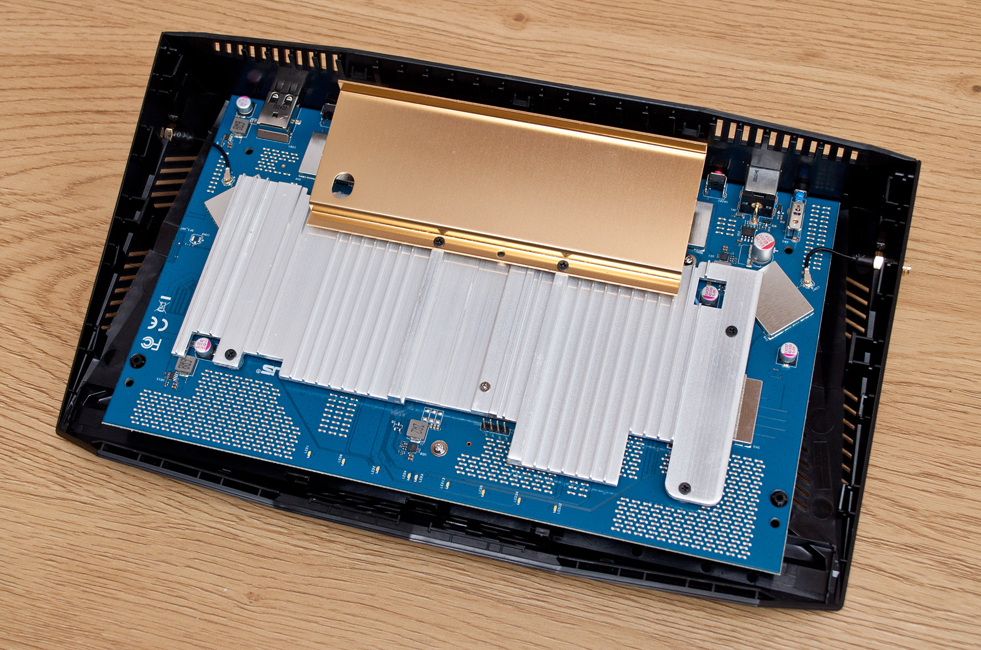 Удивительно, ASUS RT-AX88U Pro достаточно легко разбирается, после чего открывается доступ к внутренним компонентам устройства. Центральное место занимает печатная плата, у которой большую часть лицевой поверхности занимает металлический радиатор системы охлаждения. Этот радиатор имеет небольшую высоту ребер, а виднеющаяся в его верхней части золотистая пластина выполняет чисто декоративную роль.