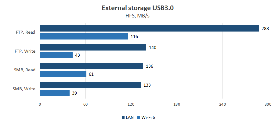 При оценке эффективности беспроводного маршрутизатора в качестве сетевого накопителя в паре с внешним SSD с интерфейсом USB 3.2 Gen1 и емкостью 480 ГБ традиционные тесты в режиме SMB были дополнены оценкой производительности FTP-сервера. Последний обеспечивает при чтении данных фантастические 288 МБ/с для клиента локальной сети, включенного в порт 2.5G Ethernet, и 116 МБ/с для беспроводного клиента Wi-Fi 6. Сервер SMB в аналогичных условиях передает данные со скоростью 136 МБ/с и 61 МБ/с для 2.5G LAN и Wi-Fi 6 соответственно. Что касается записи данных, то показатели находятся на уровне 140 МБ/с для проводного и 40 МБ/с для беспроводного клиента и почти не зависят от типа сервера.