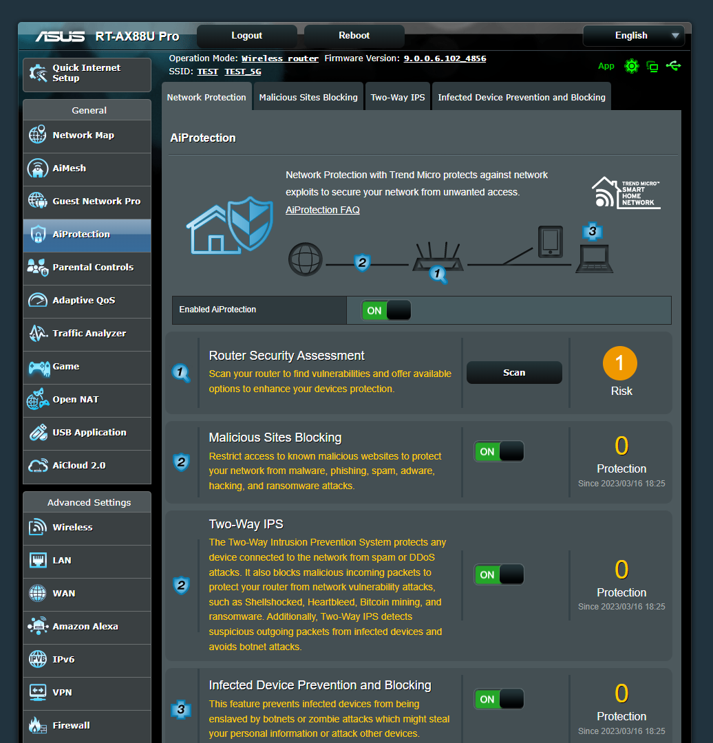 Управление комплексом защиты от киберугроз сосредоточено в одноименном меню AiProtection, где пользователи могут оценить настройки устройства с точки зрения информационной безопасности и улучшить их, воспользовавшись советами, активировать блокировку ресурсов с вредоносным содержимым и двустороннюю защиту от сетевых вторжений Two-Way IPS, а также изолировать устройства в локальной сети Комплекс AiProtection разработан в сотрудничестве с компанией Trend Micro, выступающей поставщиком базы данных сигнатур на протяжении всего жизненного цикла устройства.