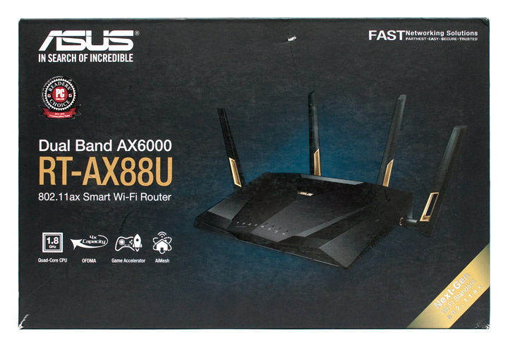 На полках магазинов беспроводной маршрутизатор ASUS RT-AX88U можно опознать по крупной коробке, на лицевой стороне которой красуются изображение устройства и наименование модели, а также ряд логотипов, обозначающих ключевые особенности новинки. Среди них следует отметить использование четырехъядерного процессора, поддержку OFDMA и фирменной функции Game Accelerator, а также совместимость с AiMesh. Последняя «фича» позволяет объединить несколько беспроводных маршрутизаторов ASUS с этой функцией в сеть для обеспечения надежного покрытия в условиях, где невозможно добиться устойчивого приема-передачи, например, в крупных домах или офисах с многочисленными препятствиями в виде стен и мебели.