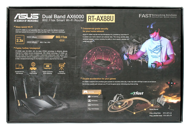С обратной стороны коробки нанесена информация о преимуществах новейшего стандарта 802.11ax над предшественниками и технологии MU-MIMO, которая обеспечивает работу нескольких беспроводных клиентов на максимально возможных скоростях, а также службу защиты от сетевых угроз AiProtection Pro и адаптивное изменение приоритета трафика Adaptive QoS. Несмотря на то, что формально RT-AX88U не принадлежит к семейству Republic of Gamers, он, подобно игровым моделям поддерживает технологию WTFast, о которой мы поговорим во время знакомства с прошивкой.