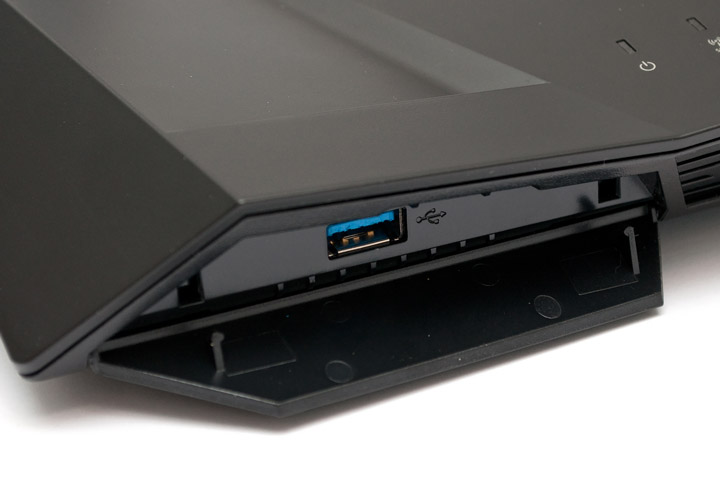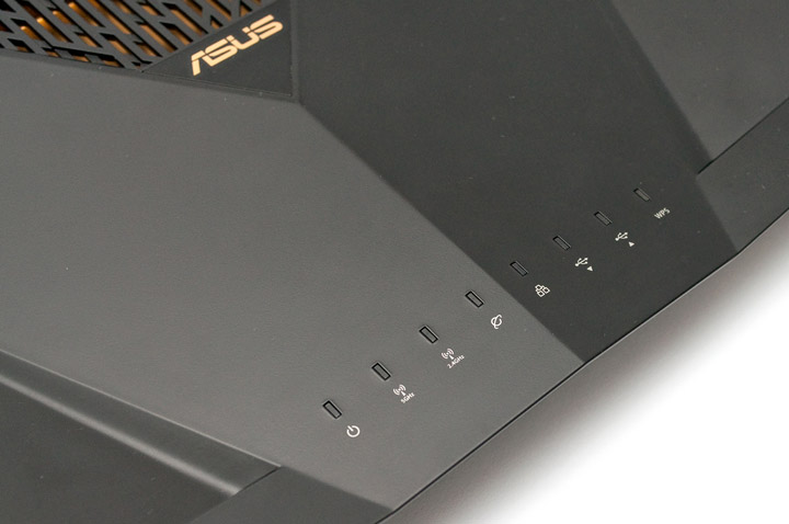 Корпус беспроводного маршрутизатора выполнен из черного матового пластика, верхняя крышка имеет крупную вентиляционную решетку, а на передней панели в ее правой части нашлось место для двух крупных клавиш, одна из которых отключает светодиодную индикацию, а вторая — деактивирует беспроводную сеть. В левой части передней панели находится откидная крышка, за которой скрывается один из двух портов USB 3.1, предназначенный для подключения дисковых накопителей или принтера.