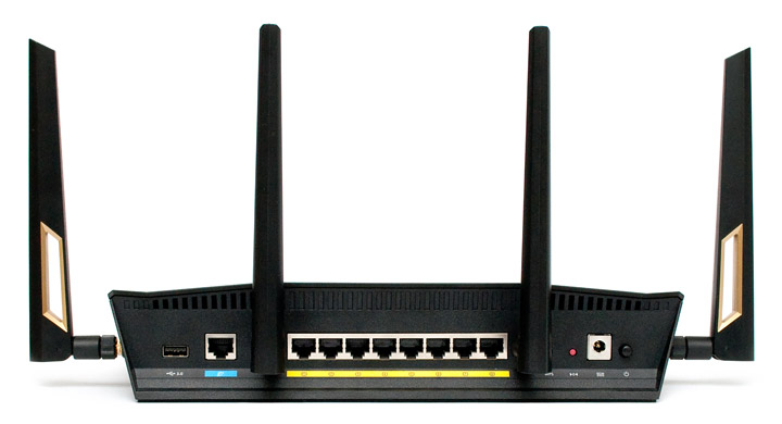 На задней панели ASUS RT-AX88U нашлось место для второго разъема USB 3.1, девяти портов RJ-45 (одного WAN и восьми LAN), клавиши WPS для активации одноименной функции быстрого подключения беспроводных клиентов, кнопки сброса настроек, разъема для подключения внешнего блока питания и выключателя.