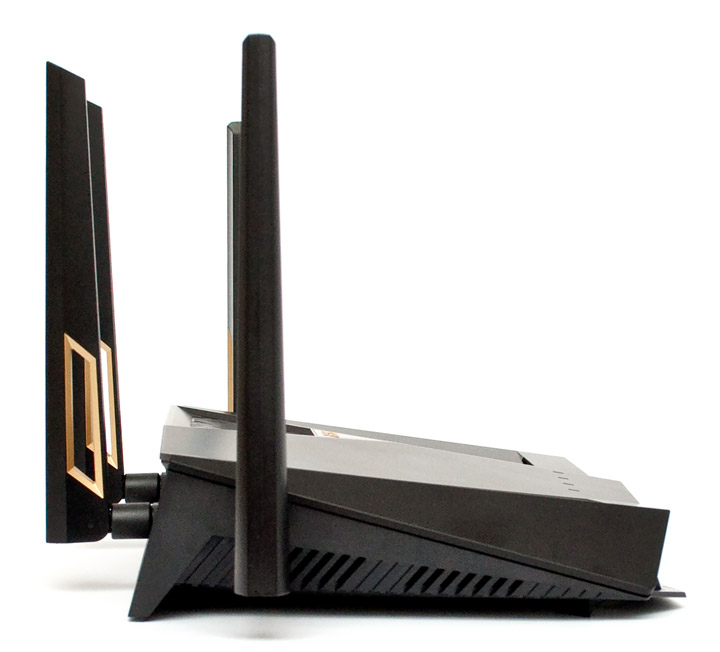 Устройство оснащено четырьмя двухдиапазонными антеннами длиной около 17 см, которые имеют SMA-разъем и шарнир, позволяющий ориентировать их под углами 45° и 90°. Пара антенн располагаются на задней панели, а две других —на боковых гранях маршрутизатора, где также находится ряд прорезей для доступа свежего воздуха внутрь корпуса.
