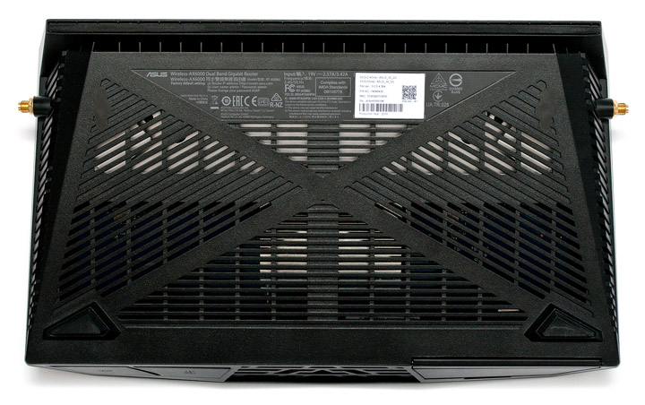 Большая часть поверхности нижней крышки RT-AX88U занята вентиляционной решеткой, сквозь которые просматриваются металлические компоненты системы охлаждения. По углам возле передней панели видны две массивные резиновые ножки, а задняя часть корпуса, снабженная полосой из пористой резины, служит третьей точкой опоры. Конструкция маршрутизатора допускает его монтаж на стену, для этого в нижней крышке имеются соответствующие пазы, прикрытые резиновыми заглушками.