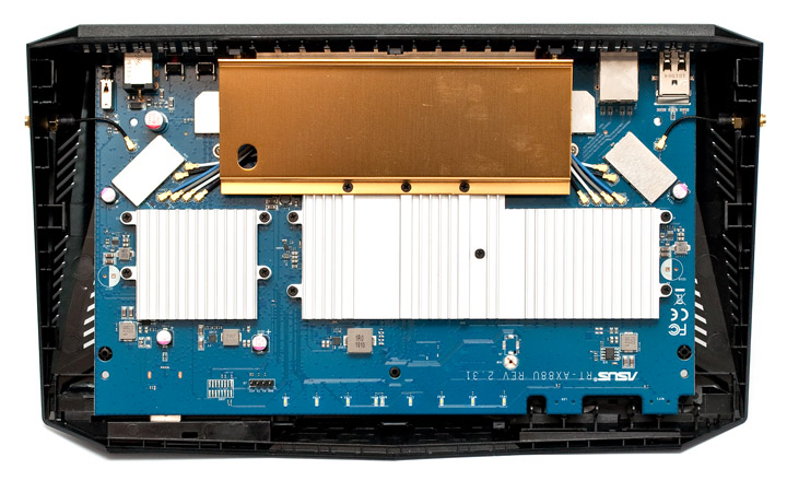 Внутри корпуса находится печатная плата, на которой заметны пара невысоких радиаторов и золотистая металлическая пластина, выполняющая, по большей мере, декоративную функцию. Следует отдать должное системе охлаждения, которая демонстрирует приемлемую эффективность и неплохо справляется со своими обязанностями. В прошивке нет средств контроля температуры, однако, за все время тестов маршрутизатор работал стабильно даже в режиме максимальной нагрузки, в то время как его корпус оставался едва теплым. Но, конечно, не следует помещать устройство в плохо проветриваемые ниши и следит за чистотой его вентиляционных решеток.