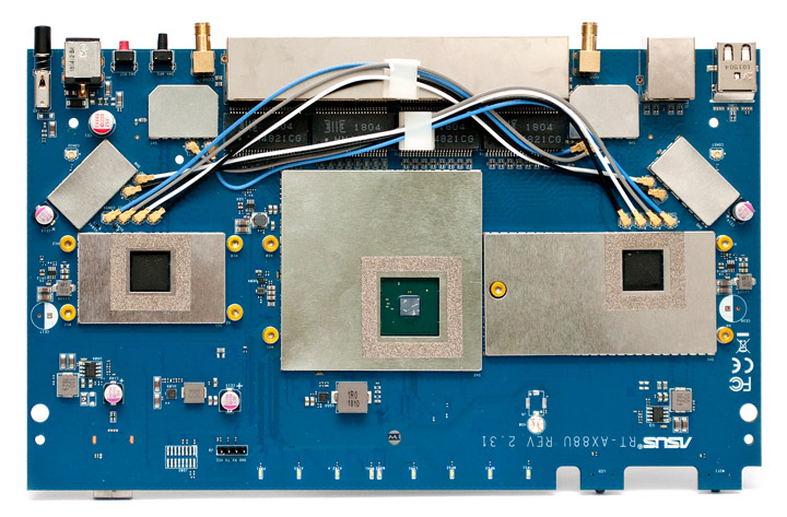 После демонтажа радиаторов нашему взору предстает «сердце» ASUS RT-AX88U — 64-битная SoC Broadcom BCM49408, в составе которой на частоте 1800 МГц трудятся четыре ядра с архитектурой ARMv8. Однокристальная система обеспечивает работу трех линий PCE Express 2.0, а также портов USB 3.0 и SATA 6 Гбит/с. Её сетевые возможности представлены блоком аппаратного ускорения IPSec и встроенным 5-портовый коммутатором Gigabit Ethernet. В качестве оперативной памяти используется два чипа DDR3 1600 МГц по 512 МБ каждый, для хранения прошивки служит микросхема NAND-флэш объемом 256 МБ, а четыре из восьми портов LAN обслуживаются отдельным коммутатором BCM53134, подключенным к SoC при помощи интерфейса SGMII+ с пропускной способностью 2,5 Гбит/с. Маршрутизатор позволяет агрегировать порты Gigabit Ethernet для удвоения пропускной способности, что будет нелишним с учетом скоростного потенциала Wi-Fi 6!