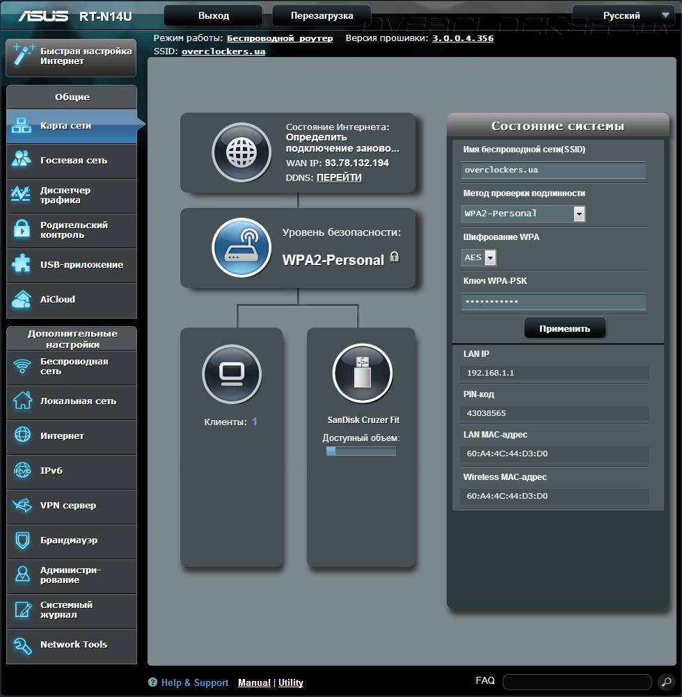 Подтверждением звания Cloud Router служит вкладка — AiCloud. Для возможности доступа к «облачному» хранилищу файлов и обмену данными пользователям маршрутизаторов ASUS предлагается одноименное приложение AiCloud, доступное для мобильных платформ на базе Android и iOS. Идея заключается в том, чтобы подключить накопитель по USB к маршрутизатору и предоставить общий доступ к информации на нем как в локальной сети, так и в Глобальной.