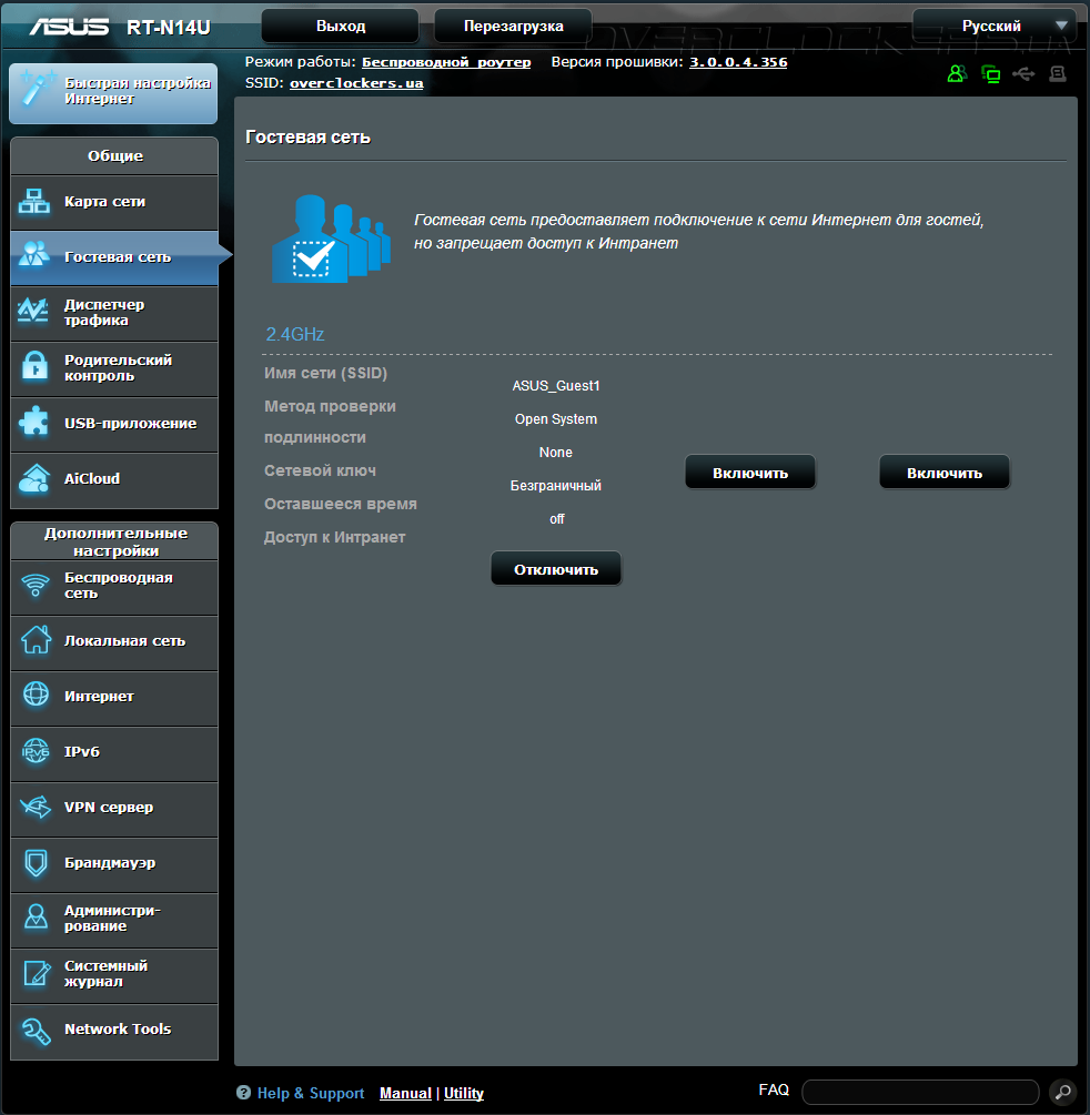 Одним из пунктов основных настроек является функция «Гостевая сеть». Суть технологии подразумевает изолирование пользователя, так называемого «гостя», подключенного к роутеру по Wi-Fi, от основной локальной сети, что полезно в плане безопасности. Данная технология будет актуальна в небольших местах собрания людей, например кафе, или даже дома, когда придут знакомые со своими мобильными устройствами и попросят временно предоставить им доступ к Интернет.