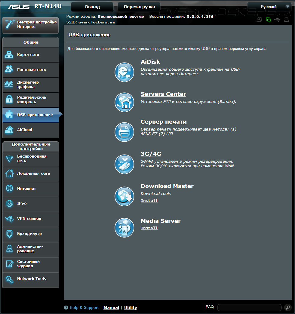 На вкладке USB-приложений, ASUS RT-N14U представит нам неплохой набор дополнительных возможностей в виде: