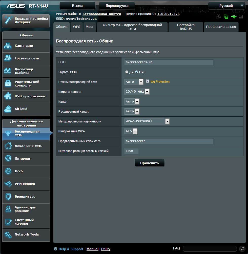 - общие настройки беспроводной сети;