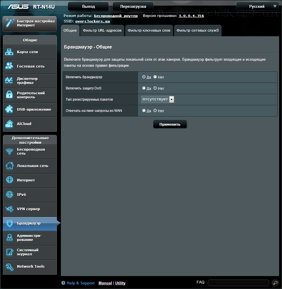 «Брандмауэр». В этом пункте меню проводится настройка безопасности маршрутизатора. Доступность оборудования с WAN-интерфейса по протоколу ICMP, фильтрация выделенных URL-адресов и фильтр по ключевым словам. Присутствует возможность активировать различные фильтры в заданные промежутки времени, что будет актуальным, если дети часто пользуются Интернетом, таким способом, их можно оградить от нежелательного контента в Сети.
