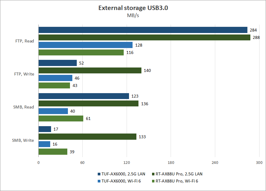 Напоследок взглянем на эффективность использования TUF Gaming AX6000 в роли сетевого накопителя при подключении к порту USB 3.2 Gen1 скоростного внешнего SSD емкостью 480 ГБ. В режиме FTP-сервера результаты скорости считывания составляют 284 МБ/с и 128 МБ/с для клиентов с проводным и беспроводным подключением соответственно, что сопоставимо с показателями RT-AX88U Pro, тогда как в операциях записи производительность составляет около 50 МБ/с и мало зависит от типа подключения. В то же время для клиентов, подключенных к порту 2.5G LAN, RT-AX88U Pro демонстрирует втрое больший результат. Что касается скорости работы сервера SMB, то показатели считывания вполне удовлетворительны — от 40 МБ/с до 123 МБ/с в зависимости от технологии доступа через локальную сеть, но скорость записи на уровне 17 МБ/с недопустимо мала.