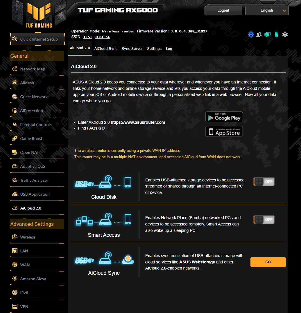 В качестве прошивки в TUF Gaming AX6000 используется ASUSWRT 4.0 на базе ядра Linux. На самом деле сколько-нибудь значимые отличия от управляющего ПО других современных беспроводных маршрутизаторов ASUS отсутствуют, так что в дальнейшем будут указаны только ее основные функциональные возможности. Веб-интерфейс имеет режим быстрой настройки Quick Internet Setup, в котором пользователи могут установить параметры подключения к Интернет-провайдеру, настроить работу беспроводных сетей и аккаунта администратора. На главном экране под названием Network Map отображается схематическая карта локальной сети со статусом всех основных подсистем, а также предоставляется возможность управления разноцветной подсветкой Aura RGB.