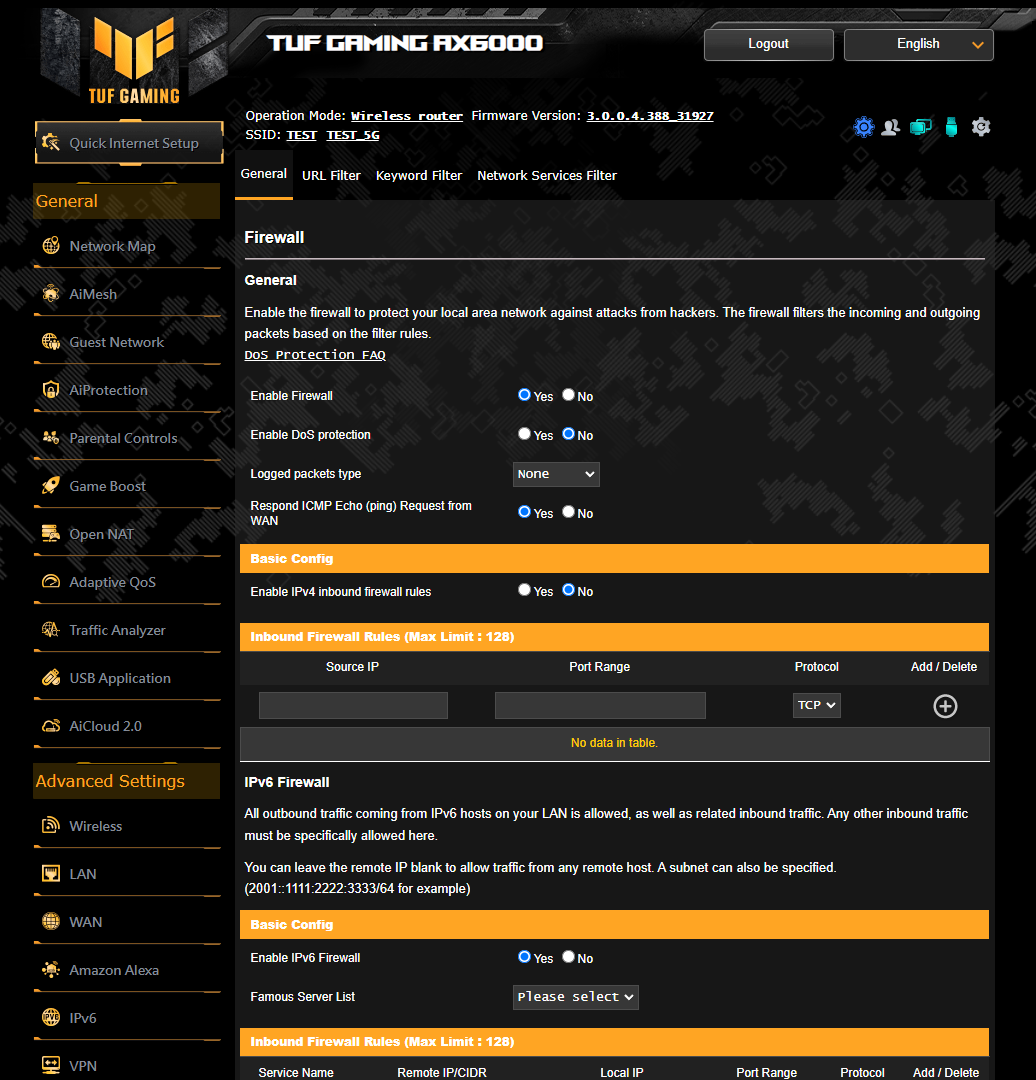 В прошивку беспроводного маршрутизатора встроен классический Firewall, обеспечивающий защиту от DDoS-атак и фильтрацию запросов по URL, ключевым словам и сетевым протоколам.