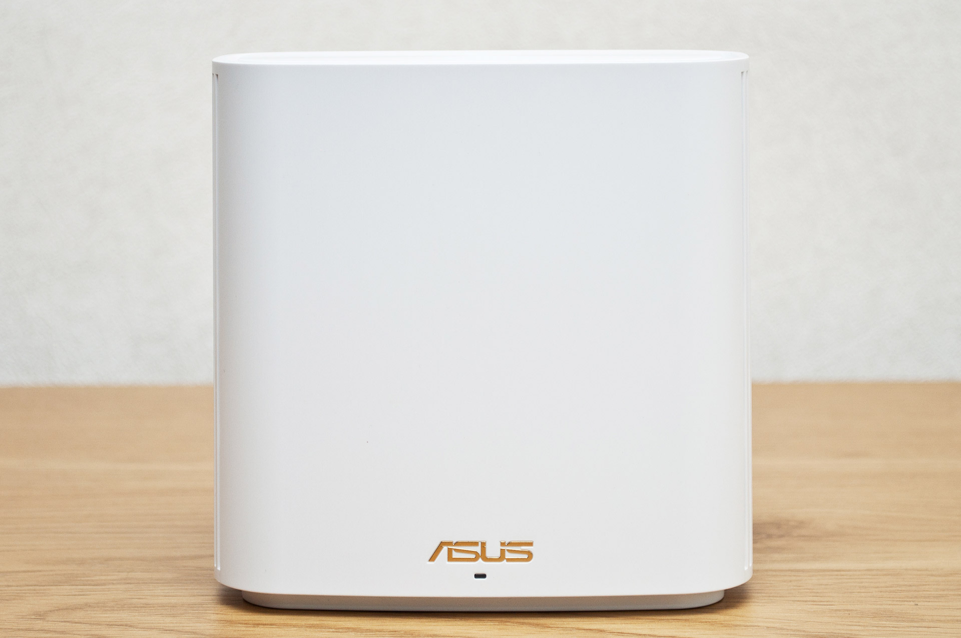 Так как AiMesh-система состоит из двух совершенно идентичных устройств, то знакомится с ZenWiFi XD будем на примере одного из них. Дизайн новинки напоминает ZenWiFi XT8, от которого были унаследованы изящные формы, тогда как габариты пропорционально уменьшились до 126,4x59,05x129,7 мм против 160x75x161,5 мм у старшей модели. Соответственно, масса одного XD6 составляет 435 г, что на 40% меньше, чем у XT8. Попавшие в тестовую лабораторию экземпляры щеголяют белоснежными пластиковыми корпусами, но в продаже можно найти устройства также черного цвета. С точки зрения практичности оба варианта равноценны: их матовые поверхности не будут притягивать пыль и отпечатки. Минималистичный дизайн передней панели разбавляет лишь объемный золотистый логотип производителя в ее нижней части. Под логотипом расположился единственный универсальный светодиодный индикатор, цвет свечения которого зависит от режима работы.