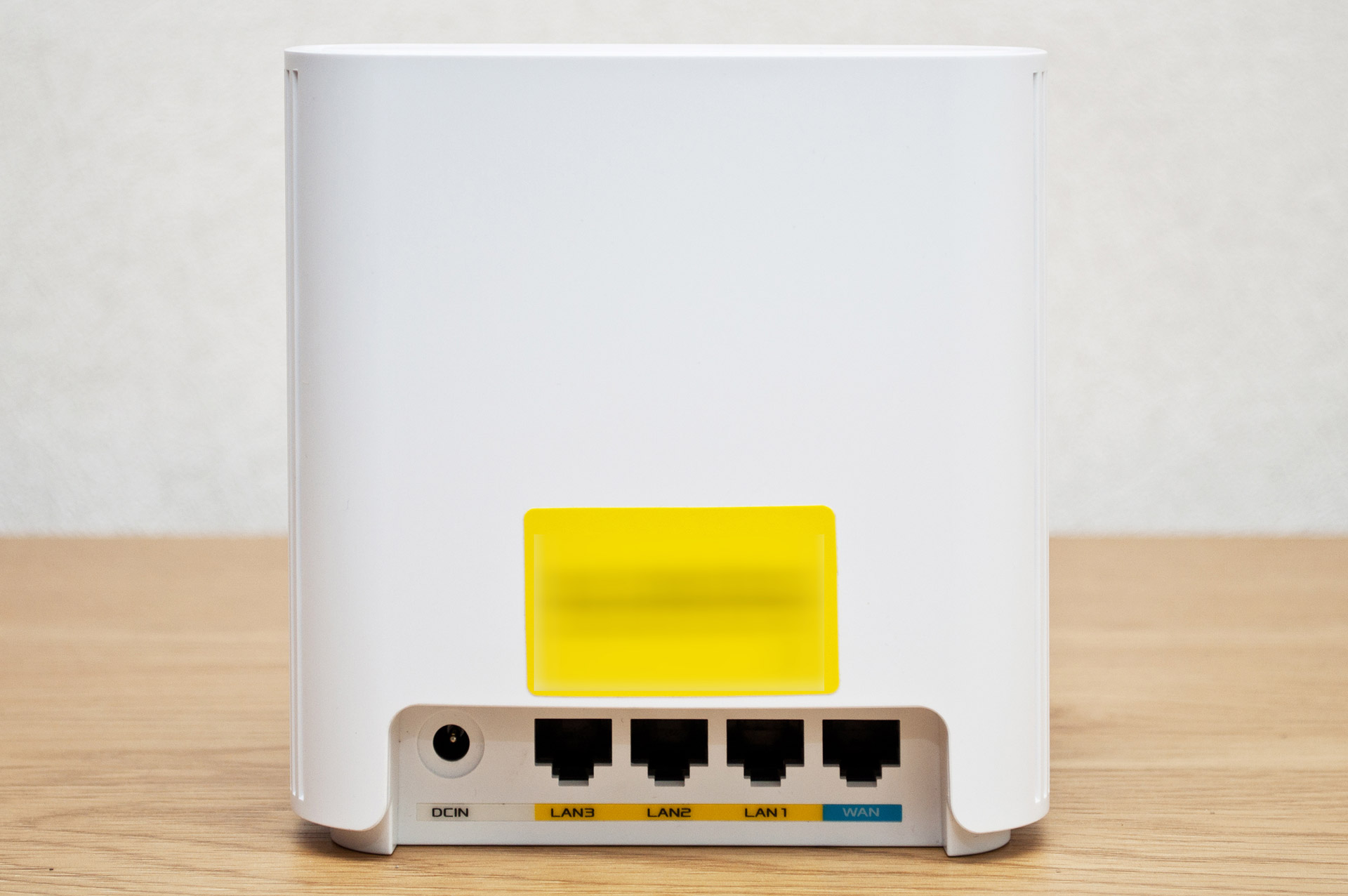 Организация задней панели крайне лаконична. Рядом с основанием находятся разъем для подключения внешнего источника питания и четыре порта Gigabit Ethernet в конструктиве RJ-45, из которых три штуки предназначены для подсоединения устройств локальной сети или узлов AiMesh, а четвертый служит для подключения к оборудованию Интернет-провайдера. В отличие от ZenWiFi XT8 новинка лишена разъема USB и порта 2,5 Gigabit Ethernet.