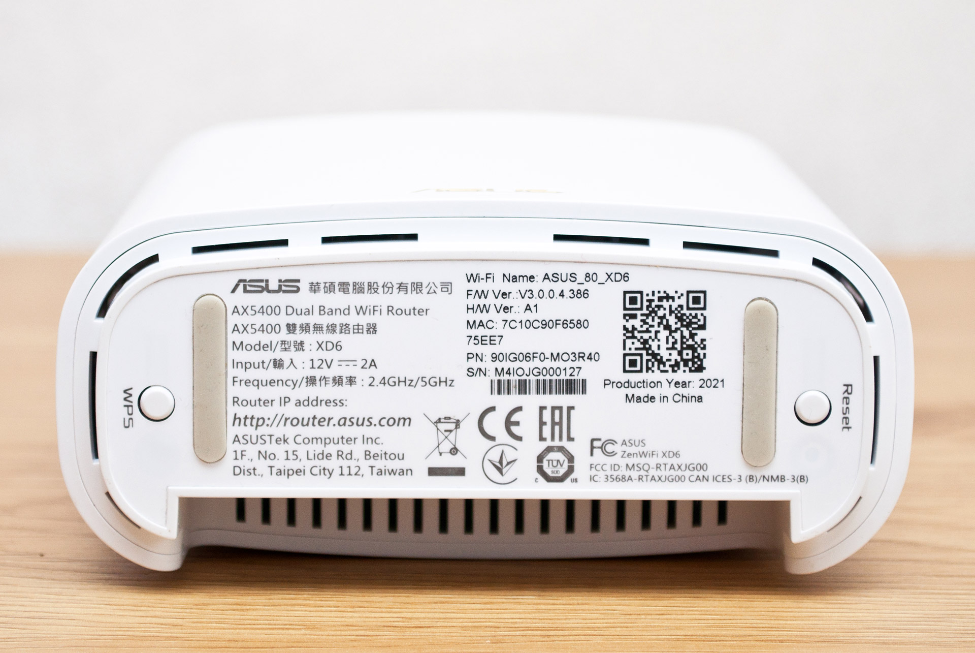 В нижней части ASUS ZenWiFi XD6 нашлось место для двух резиновых ножек, между которыми приведена служебная информация. По бокам от ножек расположились кнопки активации WPS (Wi-Fi Protected Setup) для быстрого подключения беспроводных устройств и сброса настроек прошивки. Кроме того, в нижней части корпуса заметно множество вентиляционных отверстий для конвекции воздушных потоков.