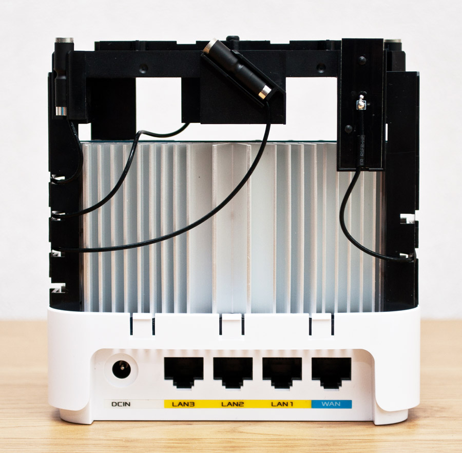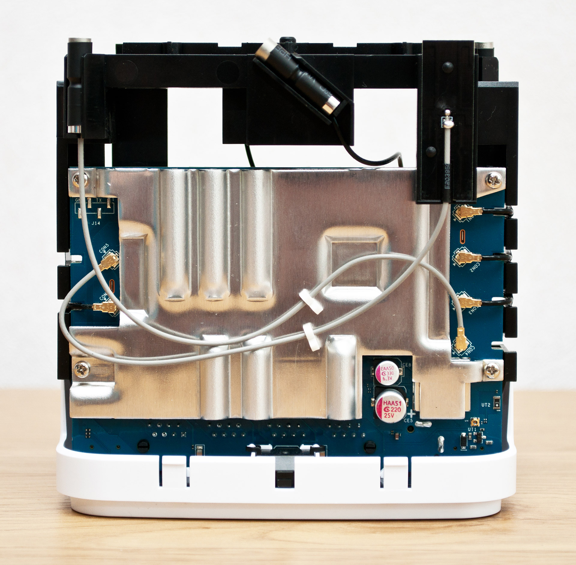 Внутри устройства находится шасси, на котором закреплены шесть внутренних антенн Wi-Fi и печатная плата, укрытая металлической пластиной, играющей роль теплоотвода.