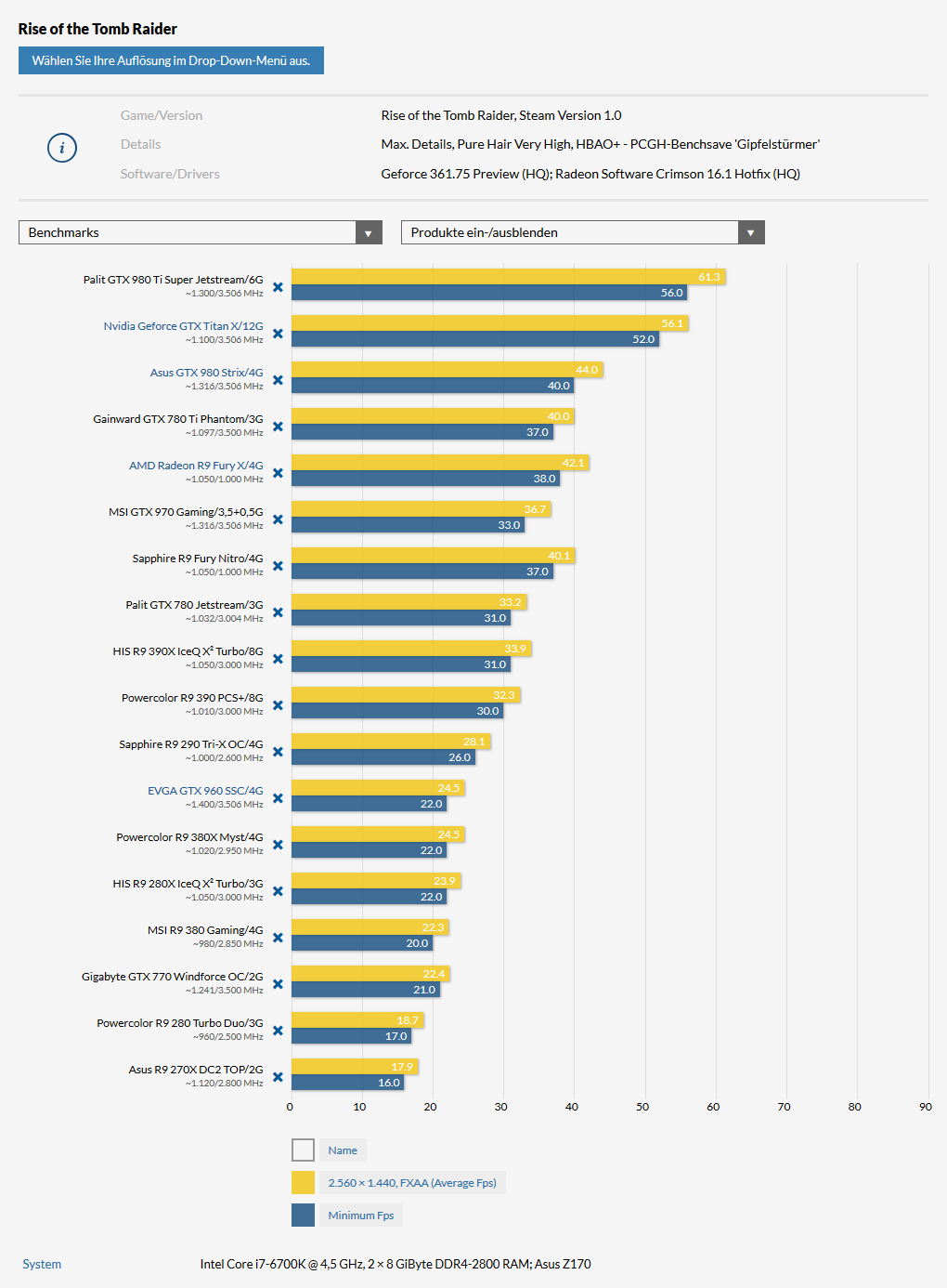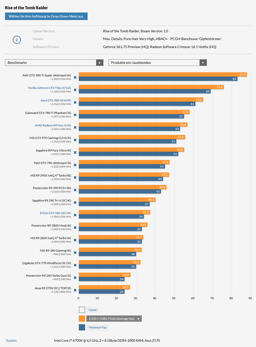 Еще до официального релиза немецкий ресурс PCGH провел тестирование распространенных моделей видеокарт в данной игре, в разрешениях 1920x1080, 2560x1400 и 3840x2160 точек, при максимальных настройках качества графики. Система базировалась на процессоре Intel Core i7-6700K (@4,5 ГГц), объем памяти DDR4-2400 составлял 16 ГБ.