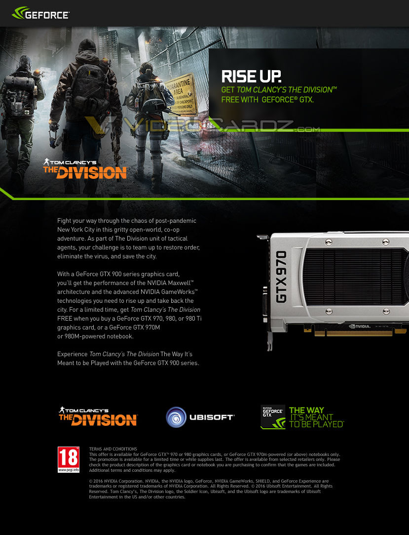 Как сообщает сайт VideoCardz, в течение нескольких дней Nvidia совместно с Ubisoft объявят о новой акции, в рамках которой покупатели видеокарт GeForce GTX 970, GTX 980 и GTX 980 Ti, а также ноутбуков, оснащённых видеоадаптерами GTX 970M и GTX 980M, получат лицензионный ключ к ещё не вышедшей игре Tom Clancy's The Division.
