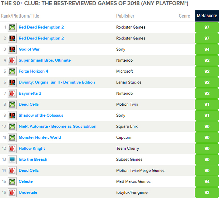Звание лучшей игры этого прошлого года досталось вестерну с открытым миром Red Dead Redemption 2 — его средний балл составляет 97 из 100 возможных. На три балла от него отстают приключенческий экшен God of War и платформер Celeste. 93/100 и третье место достулось RPG Undertale в версии для Nintendo Switch. Четвертую строчку с 92 баллами делят между собой файтинг Super Smash Bros. Ultimate, аркадная гонка Forza Horizon 4, ролевая игра Divinity: Original Sin II — Definitive Edition и слэшер Bayonetta 2 для Nintendo Switch. Отмечается, что оценки не ниже 90/100 удостоились сразу 17 проектов, лишь 4 из которых оказались новыми релизами (не сиквелами и не переизданиями), правда все они относятся к инди.