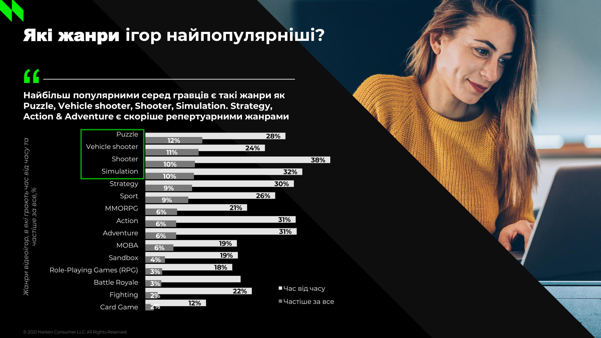 Чаще всего в игры жанров Puzzle, Vehicle Shooter, Shooter и Simulation играют 12%, 11%, 10% и 10% игроков соответственно. Время от времени украинцы играют в Shooter (38%), Simulation (32%), Action (31%) и Adventure (31%). На игры жанров Vehicle Shooter (8%) и Sport (7%) геймеры тратят в среднем в месяц 242 гривны и 342 гривны соответственно. Больше всего трат приходится на Fighting и RPG – 433 гривны и 617 гривен в месяц.
