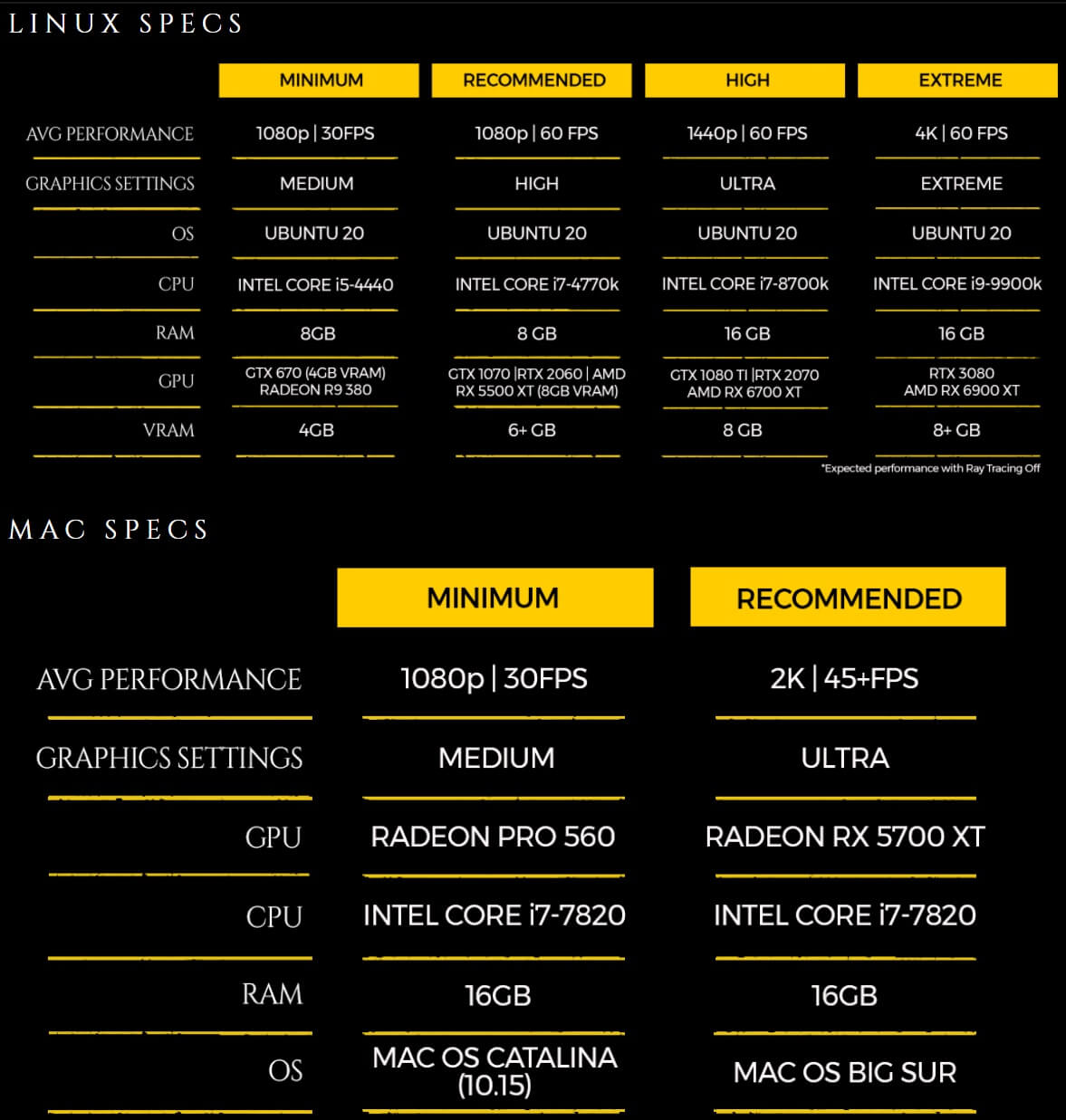 Согласно спецификациям Linux, геймерам предпочтительно использовать дистрибутив Ubuntu 20. В минимальных требованиях указаны Intel Core i5-4440 с 8 ГБ ОЗУ и Nvidia GeForce GTX 670. На другом полюсе для профиля Extreme понадобится 8-ядерный процессор уровня Intel Core i9-9900K c топовой видеокартой GeForce RTX 3080 или Radeon RX 6900 XT.