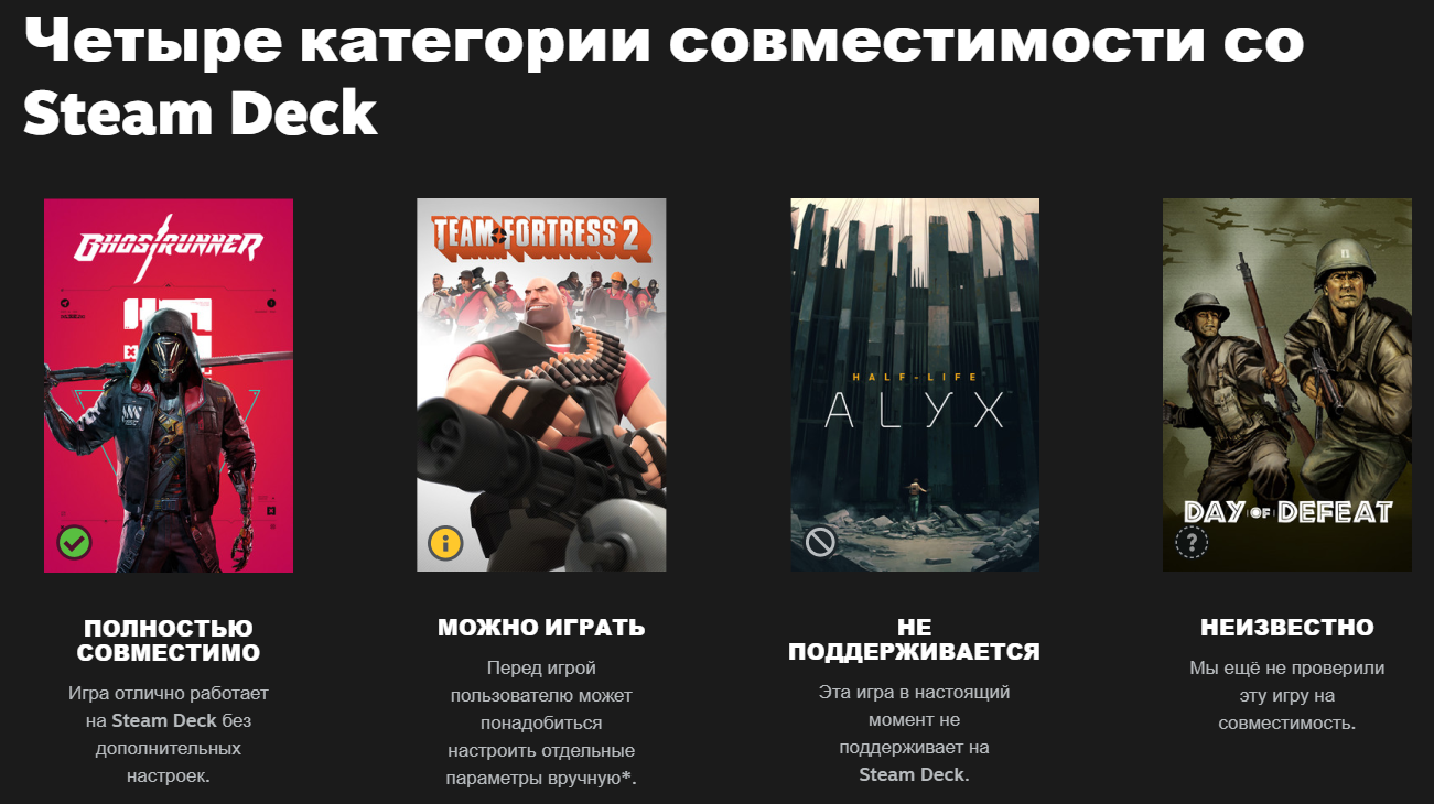 Всего Valve предусмотрела четыре категории совместимости со Steam Deck: «Полностью совместимо», «Можно играть», «Не поддерживается» и «Неизвестно». Компания намеревается проверить весь каталог игр Steam, однако, учитывая количество проектов, на это уйдёт немало времени.