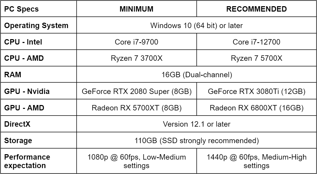 Если вас впечатлили недавно опубликованные требования The Lord of the Rings: Gollum, то Immortals of Aveum расстроит еще больше. Тут для Full HD рекомендуют процессор не слабее Core i7-9700 и Ryzen 7 3700X, видеокарту не ниже GeForce RTX 2080 Super и Radeon RX 5700 XT. Столь серьезная конфигурация должна обеспечить производительность 60 кадров при средне-низких настройках графики. Для формата 1440p разработчики рекомендуют уже GeForce RTX 3080 Ti или Radeon RX 6800 XT. И все это требуется для игры без трассировки лучей. Вероятно, в 4K не обойтись без GeForce RTX 4090 и Radeon RX 7900 XTX.
