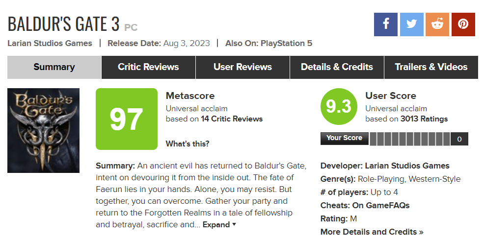 Столь высокий рейтинг на платформе PC имеет только Disco Elysium: The Final Cut, но эта игра проигрывает Baldur's Gate 3 по пользовательскому рейтингу от простых игроков. Примечательно, что третье место рейтинга на Metacritic принадлежит Half-Life 2 с 96 баллами от критиков. Пользовательский рейтинг Baldur's Gate 3 сейчас 9,3 баллов против 9,2 баллов у Half-Life 2. У игры Larian Studios пока мало оценок от профильных медиа. Поэтому со временем общий балл может немного измениться. В любом случае ясно, что Larian Studios выпустила одну из лучших игр всех временен для PC.