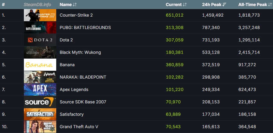Что касается самых популярных проектов среди пользователей Steam, то их перечень преимущественно остаётся неизменным. В десятку лидеров вошли Counter-Strike 2, PUBG: Battlegrounds, Dota 2, Black Myth: Wukong, Banana, Naraka: Bladepoint, Apex Legends, Source SDK Base 2007, Satisfactory и Grand Theft Auto V.