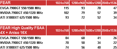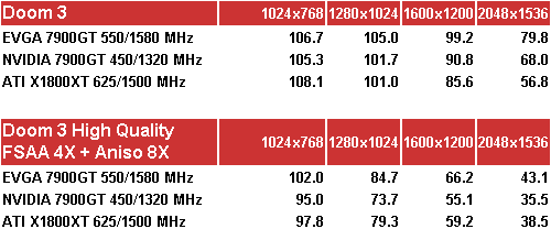 На сайте The Inquirer представлен обзор топовой модели EVGA с частотами 550MHz/1580MHz, а также карты от nVidia c номинальными частотами. Для сравнения была выбрана карта ATI Radeon X1800XT с 512MB, (хотя логичнее было бы сравнивать с 256MB моделью). После того как ATI снизила стоимость, ее карты также находятся в том же ценовом диапазоне, что и 7900GT.