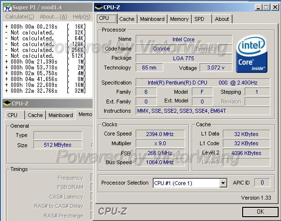 Но, нашелся один энтузиаст, VictorWang, который смог достать для тестирования материнскую плату на базе Intel G965. И она смогла продемонстрировать стабильную работу с процессором Core E6600 (2.4 ГГц).