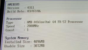 Однако, после установки 4-х планок памяти на материнскую плату ASUS A8N Platinum SLI, оказалось, что Windows XP 32-bit не может адресовать блолее чем 3072MB. Сама же материнская плата и чипсет успешно распознали все 4GB установленной памяти, такие же результаты показали и утилиты типа CPUZ, однако, реально возможно работать только с 3GB памяти.