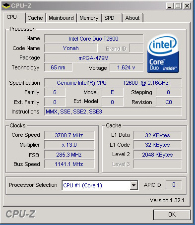 На страницах сайта NordicHardware можно узнать о разгоне процессора Core Duo T2600 (2160 Мгц) до 3708 МГц. Такой результат получен благодаря применению материнской платы AOpen i975Xa-YDG. Полное описание и тесты, которой можно найти здесь. Материнская плата основана на чипесете Intel 975X и оснащена процессорным разъемом Socket-479m.
