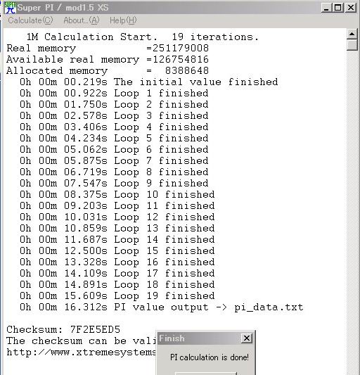 Процессор стабильно прошел тест Super PI и выдал результат в 16,312 с. Нужно сказать, что использовалась версия программы mod 1.5 XS, которая не округляет результат до целого значения. Помниться мы писали о Pentium XE 955 разогнанном до частоты 7.1 ГГц и такой процессор смог показать результат "всего" 18,859 с. Но извините, разница по частоте составляет 3400 Мгц и мало того Core Duo T2600@3708 МГц показывает в Super PI еще и более лучший результат.