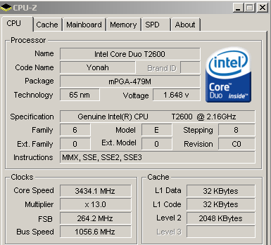 Процессор Core Duo T2600 был разогнан до частоты 2434 МГц при напряжении 1,65 В.