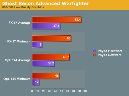 Опять бросается в глаза то, что средние показатели практически не отличаются, но при большом количестве объектов для просчета и соответственно низком FPS, производительность при задействовании PhysX катастрофически падает.