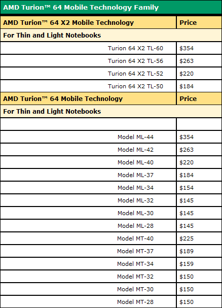 Цены на Turion 64 X2 начинаются с отметки в $184 за TL-50 (1,6GHz/256KB L2 cache) и до $354 за TL-60 (2GHz/512KB L2 cache).