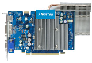 Albatron Technology представила GeForce 7300GT с пассивным охлаждением. Графическое ядро работает на частоте 400 МГц, память на частоте 350(700) МГц. Такие частоты несколько выше рекомендованных. Сегодня мы уже познакомились с аналогичной платой от Gainward. Пассивное охлаждение применяемое Albatron, позволяет снизить температуру GPU на 6° по сравнению с другим видеокартами 7300GT, использующими пассивное охлаждение.