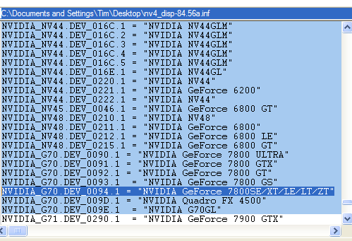 NGOHQ обнаружили в драйверах ForceWare (84.56a), доставшихся им от одного из OEM партеров nVidia, интересную строку. А именно, в файле nv4_disp.inf – было обнаружено следующее: NVIDIA_G70.DEV_0094.1 = "NVIDIA GeForce 7800SE/XT/LE/LT/ZT". Возможно, такие видеокарты появятся только для OEM рынка (как 7900GS), а может и в розничной продаже, в чем я сильно сомневаюсь.