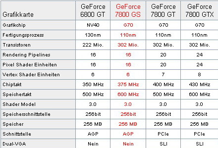 Давайте посмотрим на характеристики GeForce 7800 GS AGP в сравнении с другими представителями семейства GeForce. Думаю немецкий язык, не помешает разобраться, что к чему :)