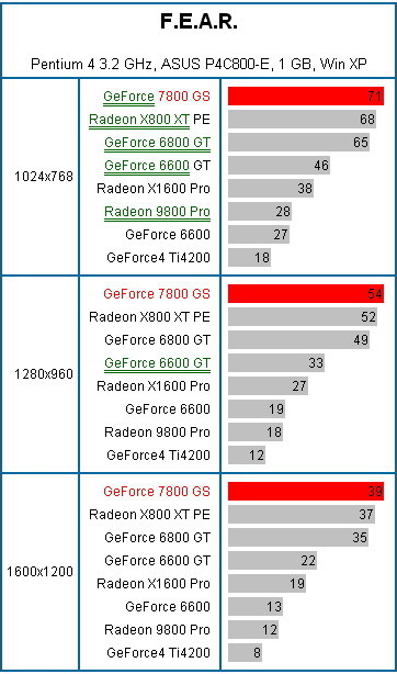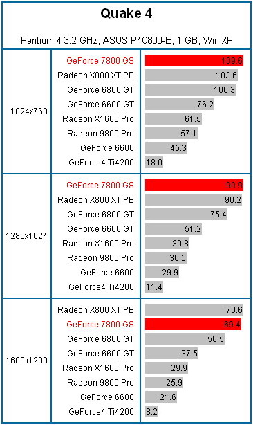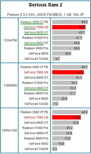 Кроме того в тестировании принимали участие видеокарты: GeForce 6800 GT (256 Мб), GeForce 6600 GT (128 Мб, 500/450 МГц), GeForce 6600 (128MB, 300/250 MHz), Radeon X800 XT Platinum Edition (256MB), Radeon X1600 Pro (512MB), Radeon 9800 Pro (128MB) и раритет GeForce4 Ti4200 (128MB).